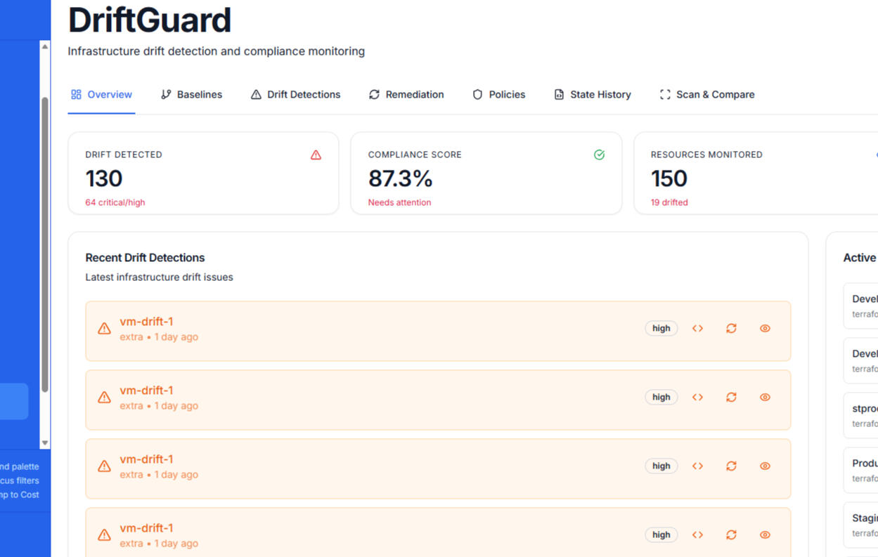 Infrastructure drifts faster than detection. Our platform automatically compares actual state to Terraform code and detects configuration drift so teams can maintain infrastructure-as-code compliance in real-time — not through periodic manual audits.