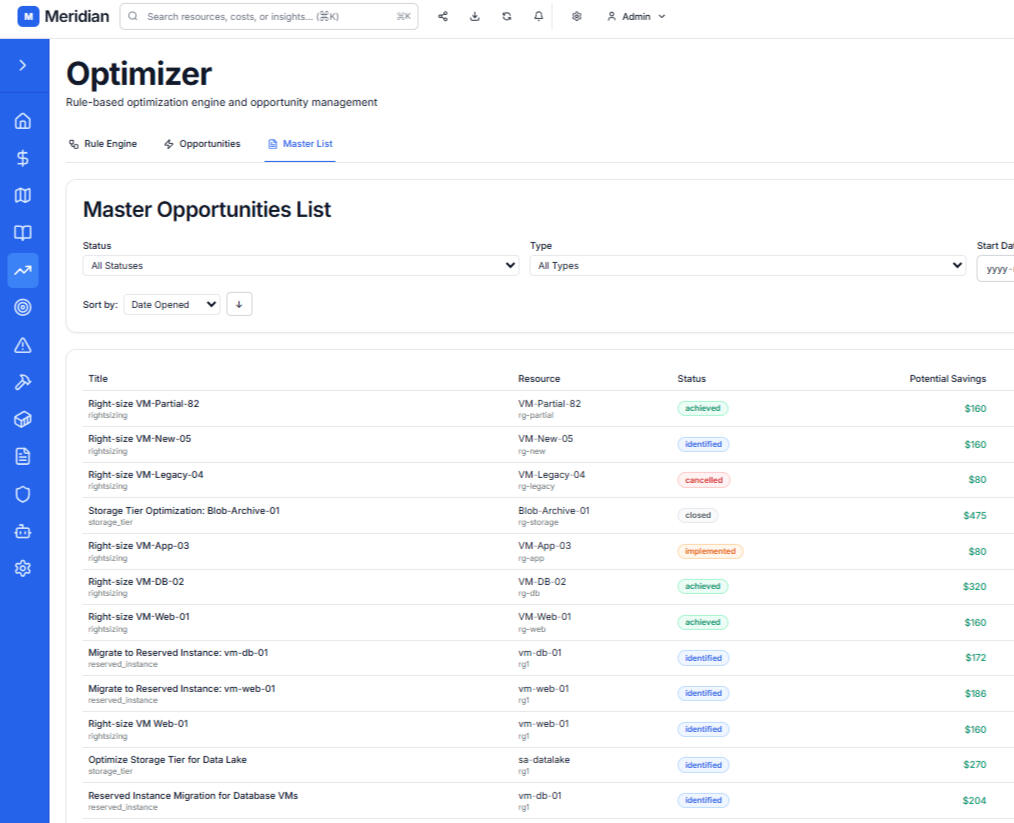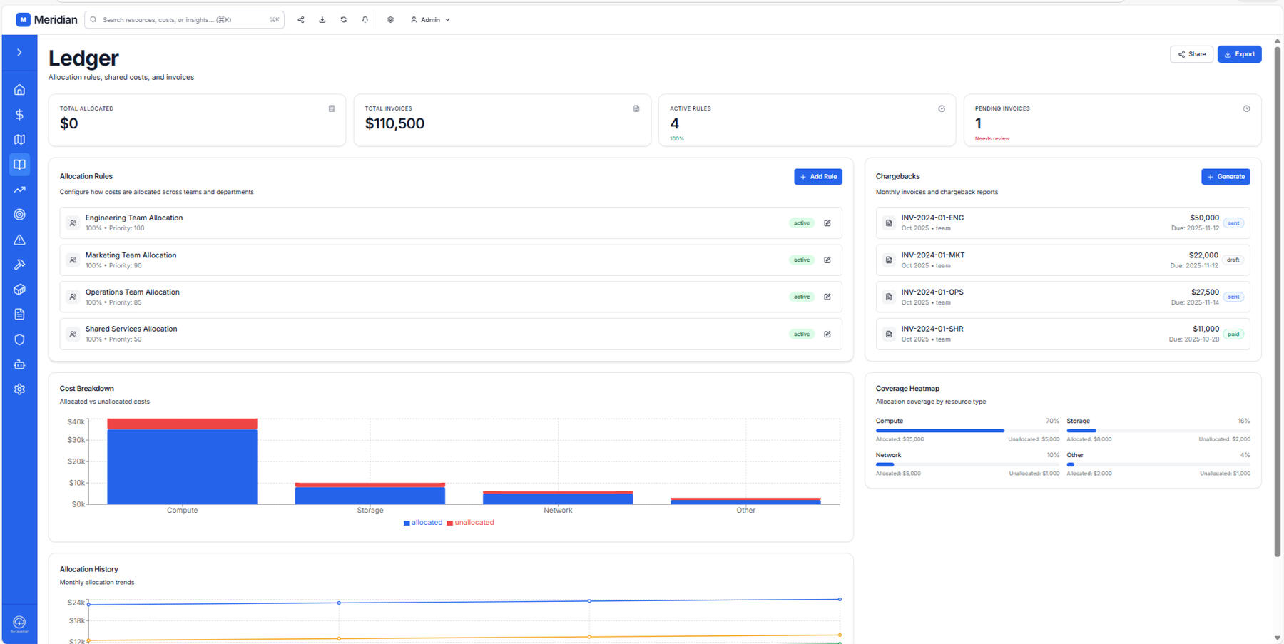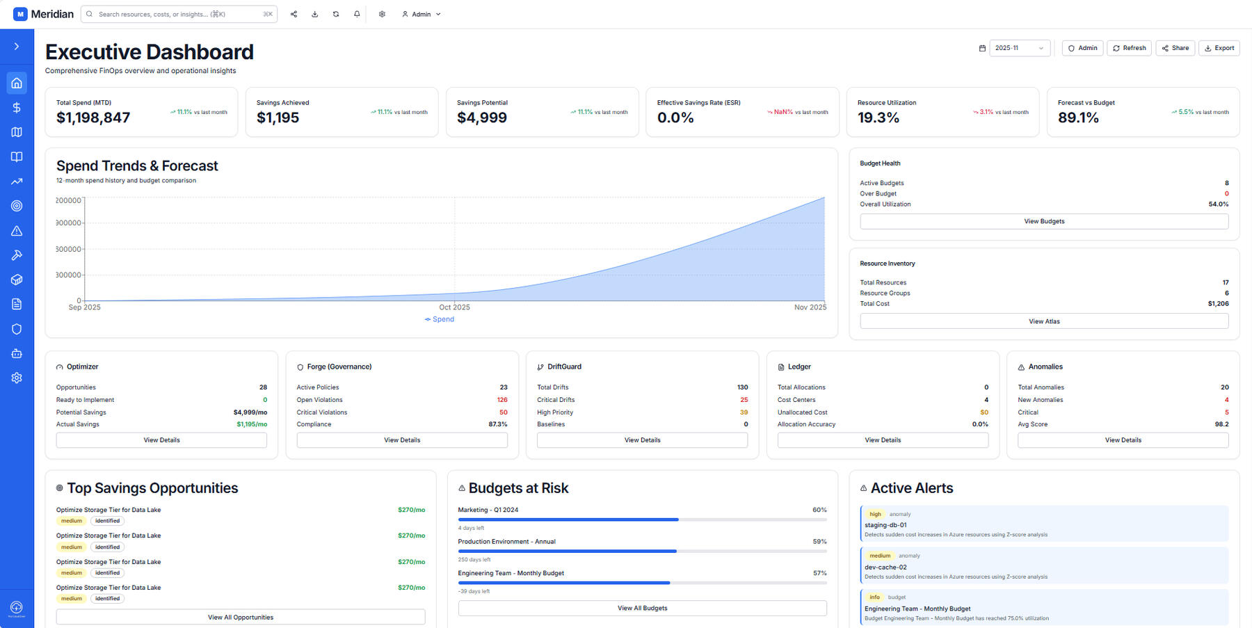 Cloud costs spiral faster than manual tracking. Meridian is the self-hosted FinOps platform that automatically provides end-to-end cost visibility, allocation, optimization, and governance across Azure tenants so teams can control cloud spending in days — not months of fragmented tools and spreadsheets.