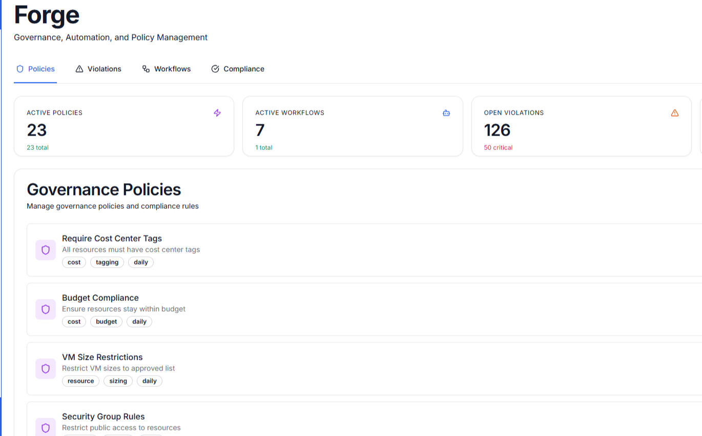 Policy violations accumulate faster than manual audits. Our platform automatically enforces governance policies and remediates violations so teams can maintain compliance and security standards continuously — not through quarterly reviews.